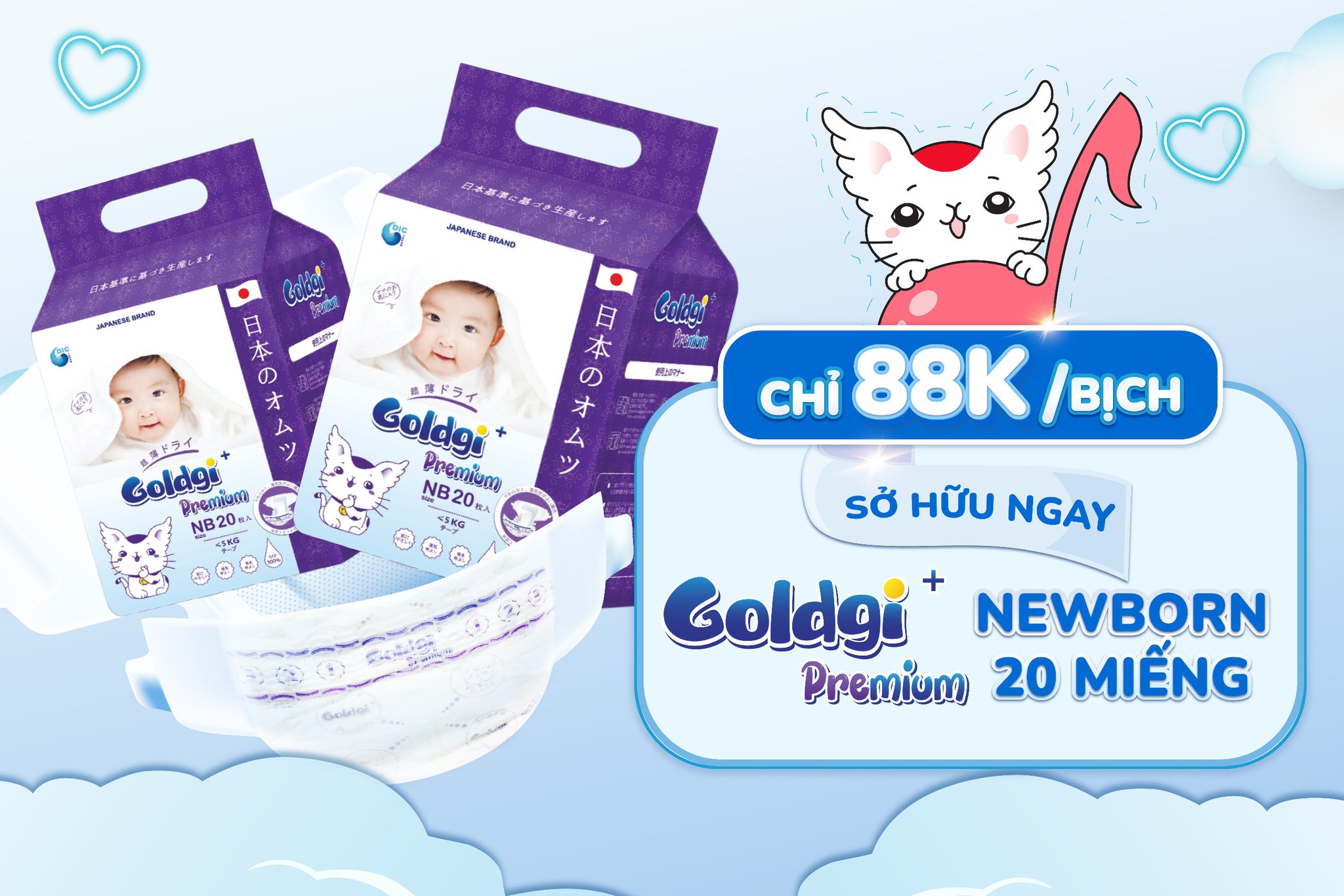 Tháng 12/2023, bỉm Nhật Goldgi chính thức ra mắt sản phẩm siêu tiện lợi: Goldgi+ Premium NB mini size 20 miếng.